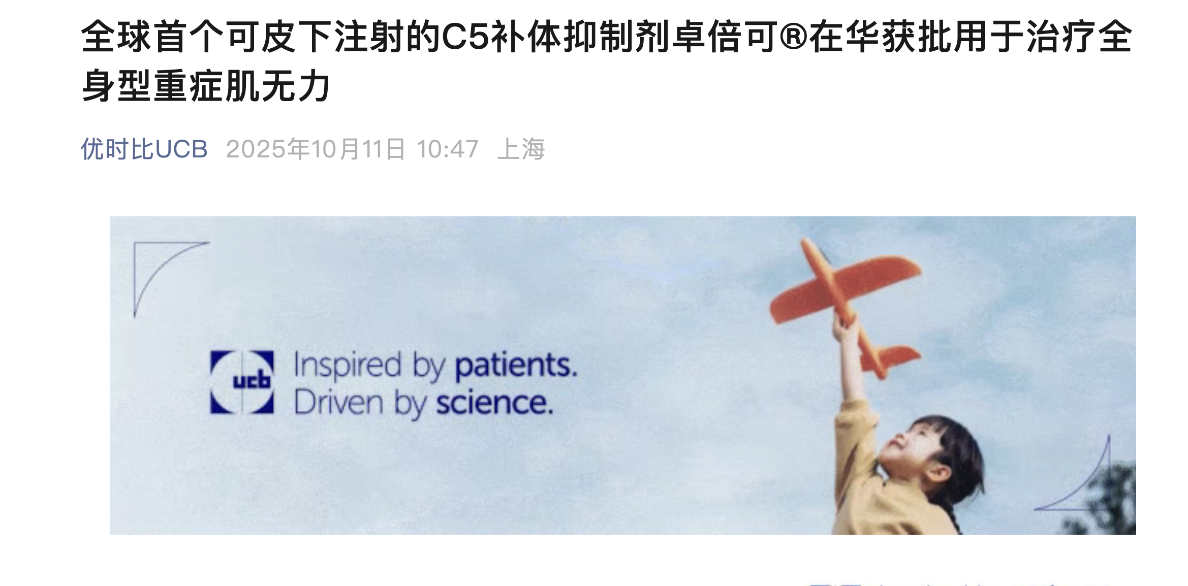 10月11日,宇宙生物制药公司优时比(UCB)文告,中国国度药品监督解决局(NMPA)已批准泽卢克布仑钠(商品名:卓倍可)上市许可,与成例诊治药物聚会用于诊治抗乙酰胆碱受体(AChR)抗体阳性的成东说念主全身型重症肌无力患者。