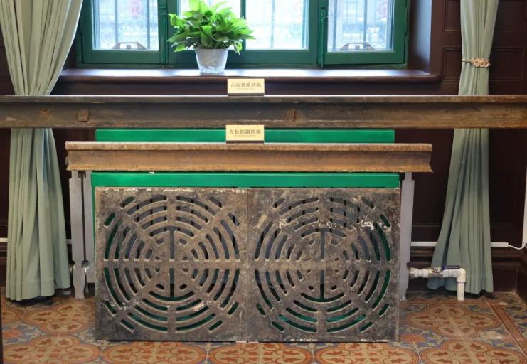 站内胪列了很多铁路老物件,比如留存下来的两条铁轨,一条是吉长铁路铁轨,上头刻有“邮传部吉长铁路”的字样,还有一条是吉海铁路铁轨。